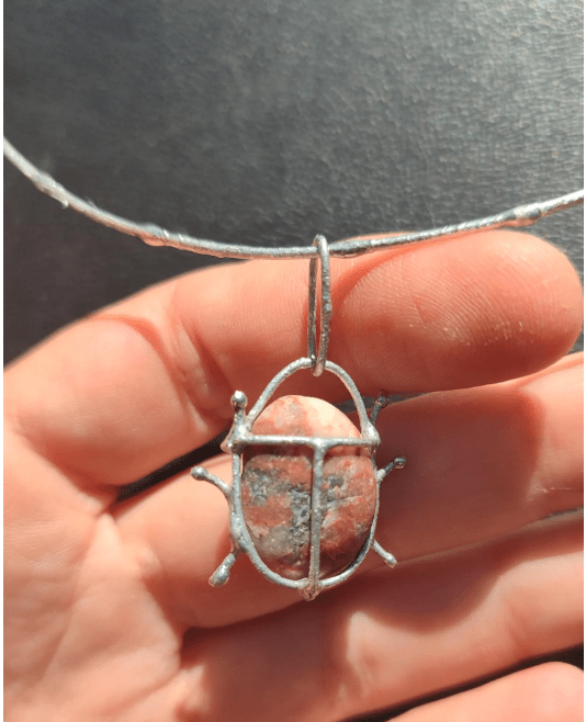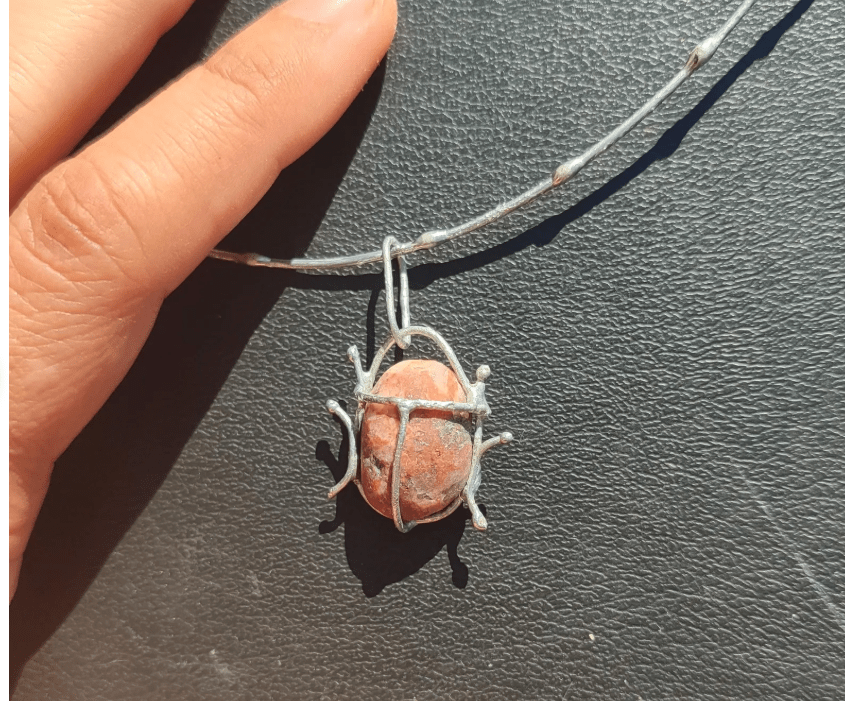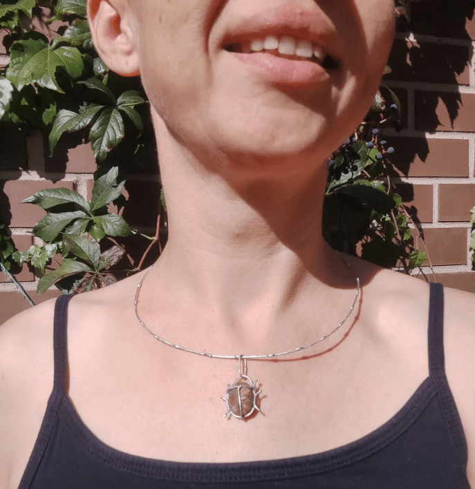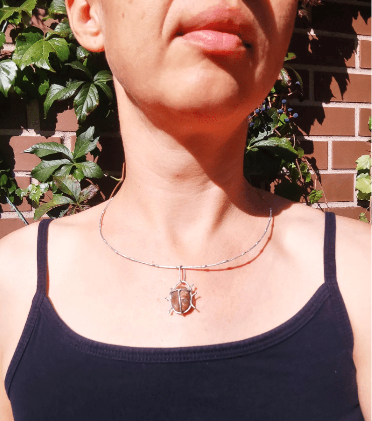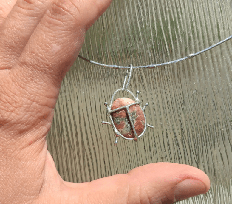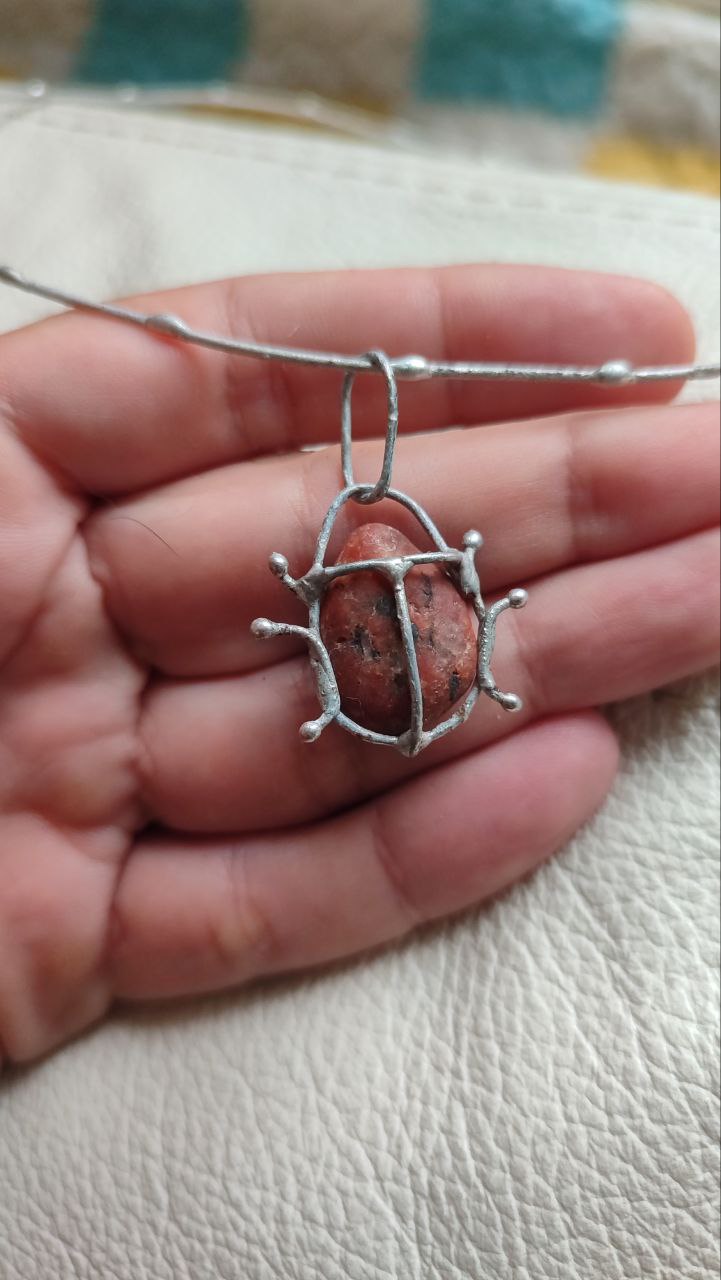 Unique little bug pendant, made in stained glass technique using red beach pebble. On a wire necklace (length can be adjusted a bit).