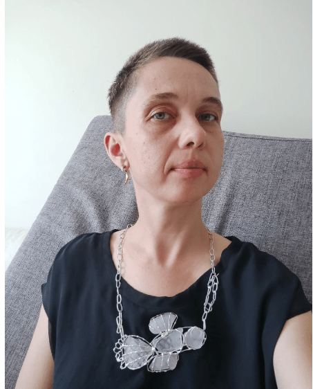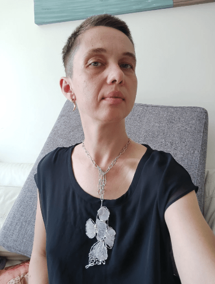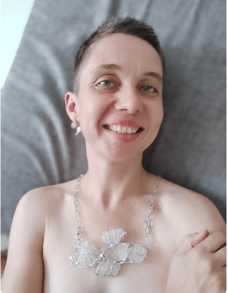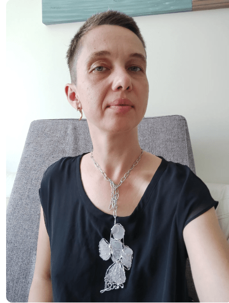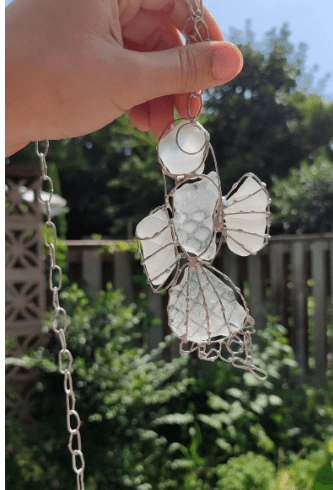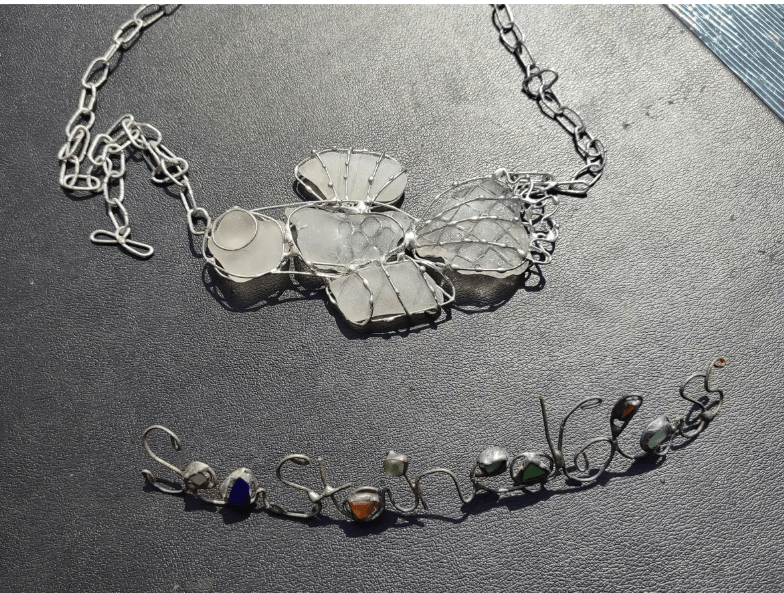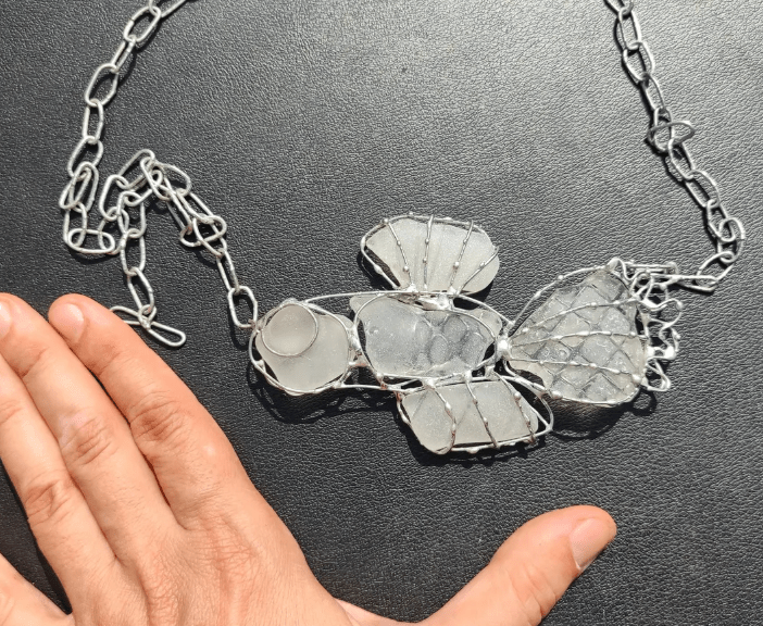 Statement necklace in form of a fish made of unique pieces of patterned sea glass. On a handmade chain, can be worn both gorizontally and vertically.