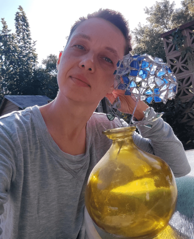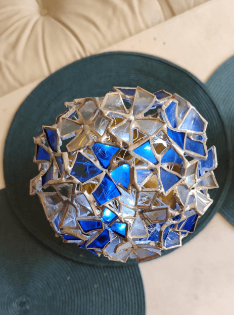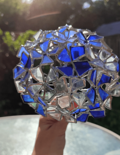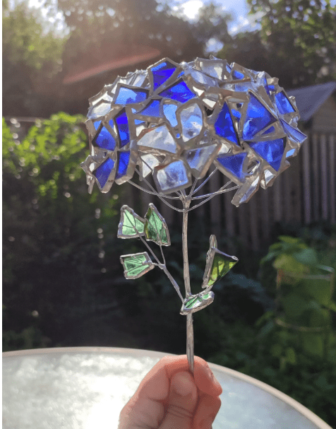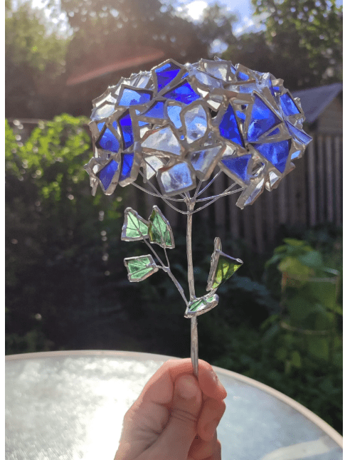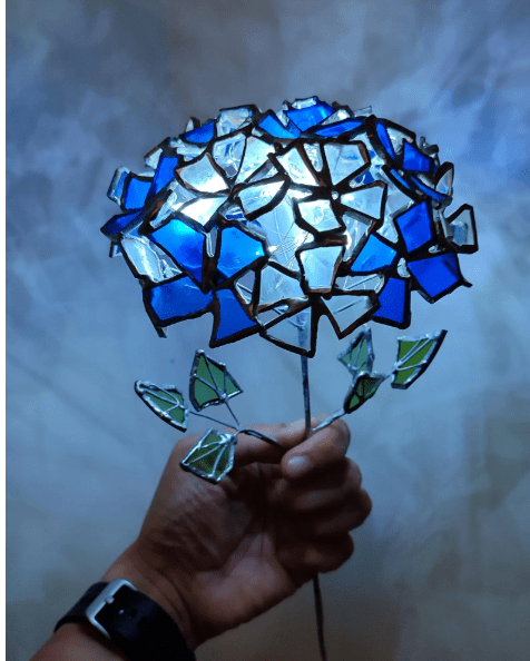 Hydrangea flower made in stained glass technique of bottle glass + stained glass scraps. Every flower will be unique, I make them freehand, so they differ almost like the real ones 🙂