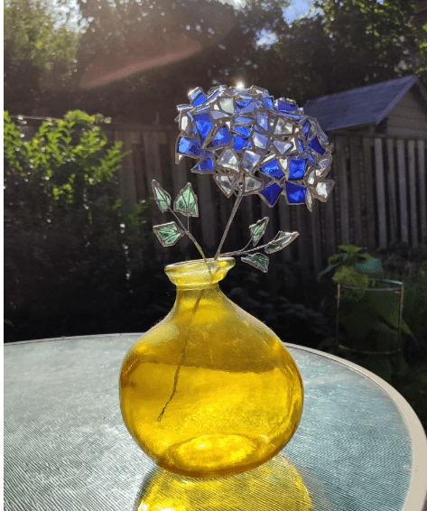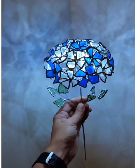 Квітка гортензії виконана в вітражній техніці з пляшкового скла + обрізків вітражного скла. Кожна квітка буде унікальною, я роблю їх від руки, тому вони відрізняються майже як справжні 🙂
