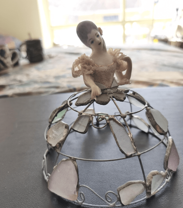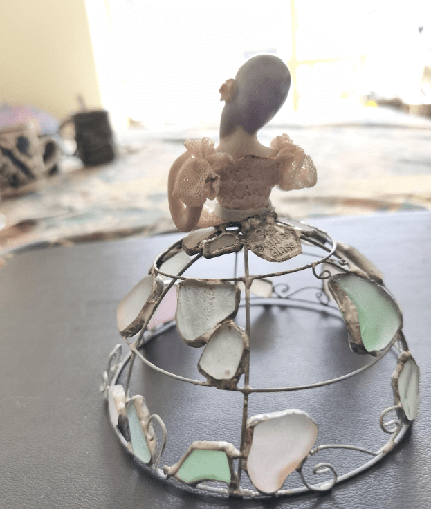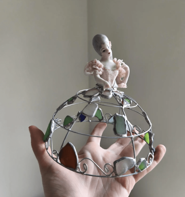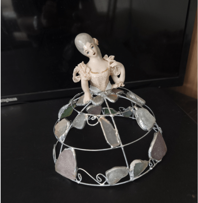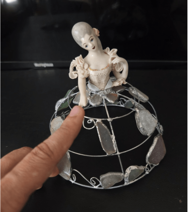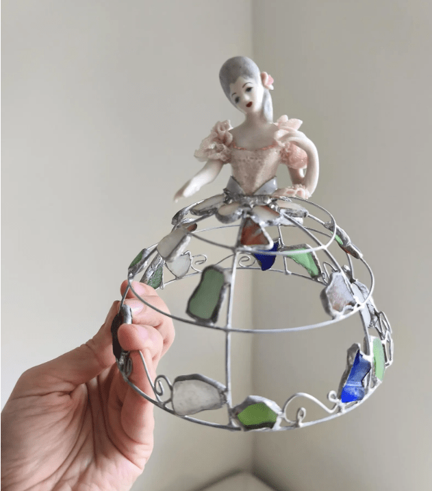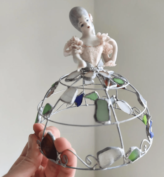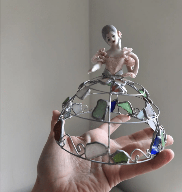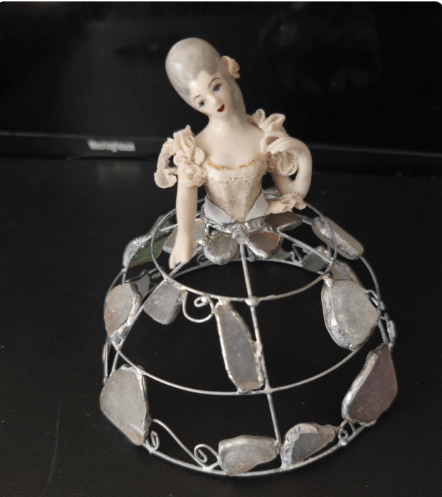Made in stained glass technique of broken porcelain figurine (she has broken fingers!), metal wire, sea glass pieces. Only one.