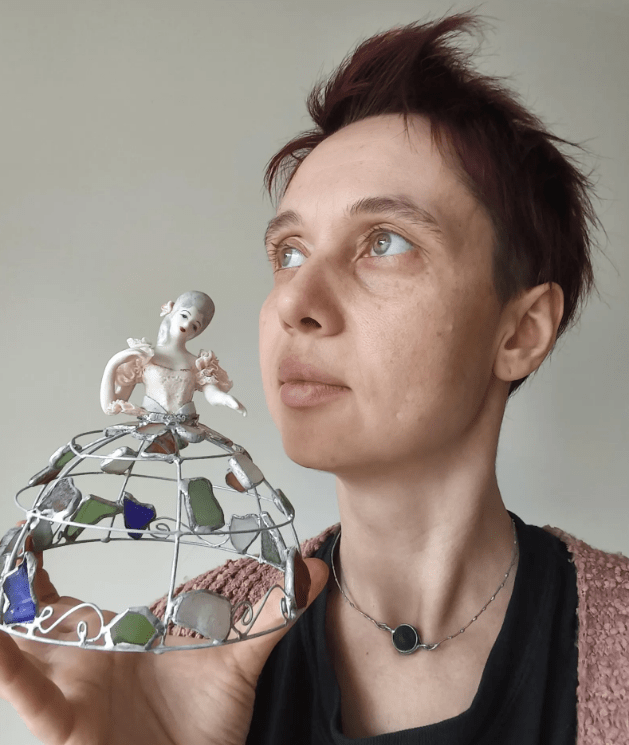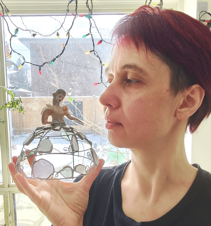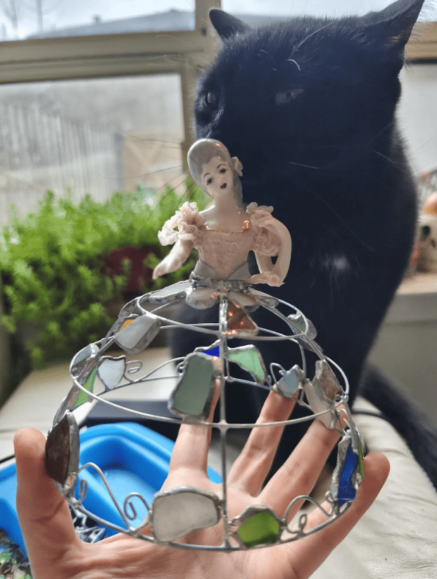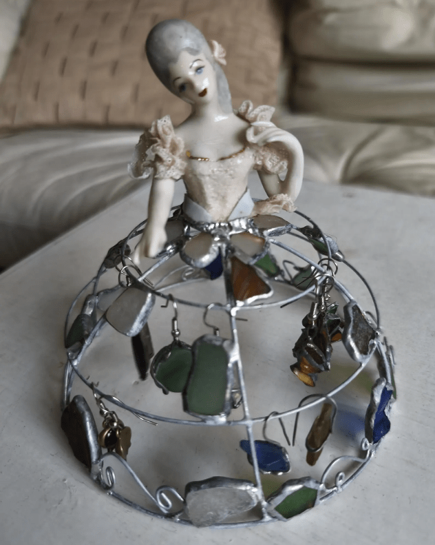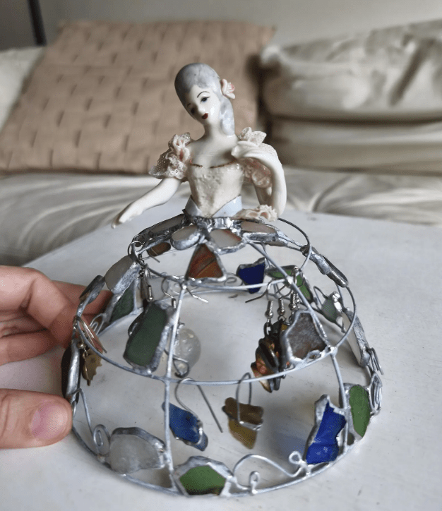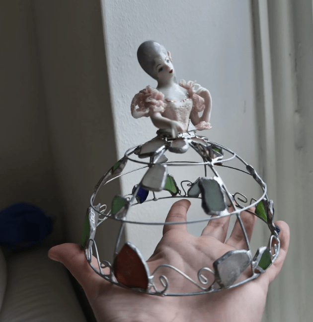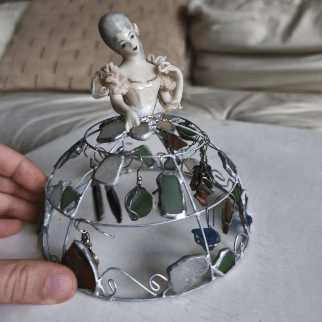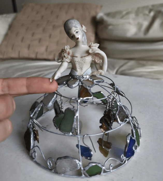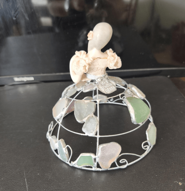 Made in stained glass technique of broken porcelain figurine (she has broken fingers!), metal wire, sea glass pieces. Only one.